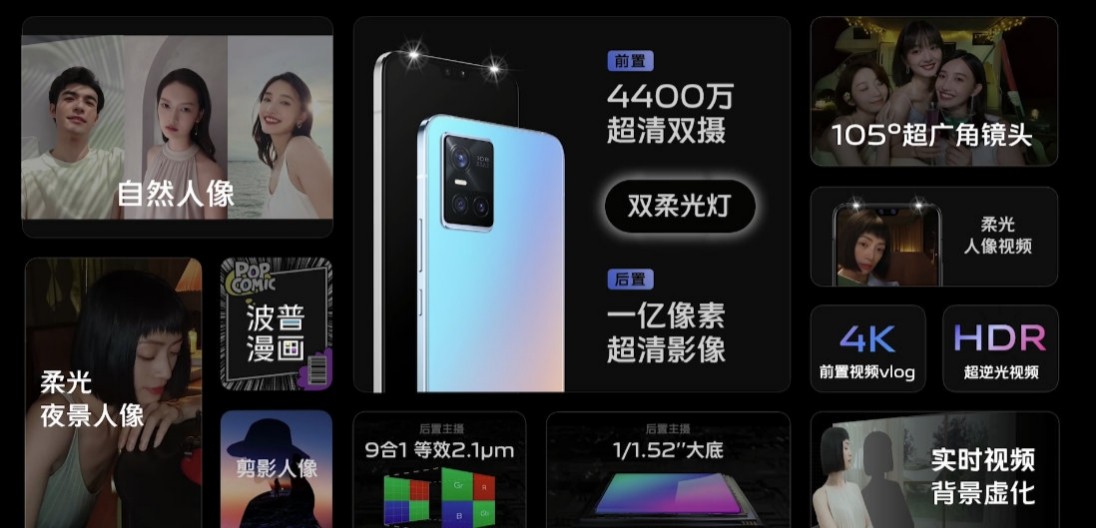 前置4400万像素主摄(f/2.0光圈)+800万像素超广角+隐藏式双柔光灯+AF自动对焦+光学防抖+自然人像+夜景人像+视频人像