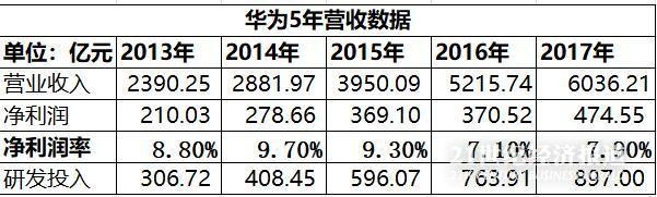 3月30日,华为发布了2017年全年业绩报告:销售收入6036亿元人民币,同比增长16%。净利润474亿元,净利润率7.9%,比2016年提升0.8个百分点。