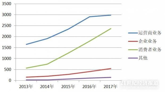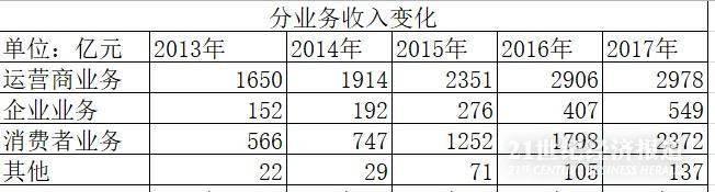 分业务来看,传统业务运营商业务收入占据整体的49%,同比增长3%;消费者业务收入占据39%,同比增长32%;企业业务收入占据9%,同比增长35%;2017年新成立的云BU业绩并未在财报单独披露。