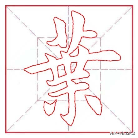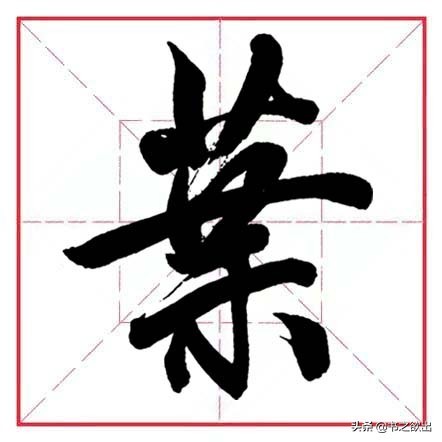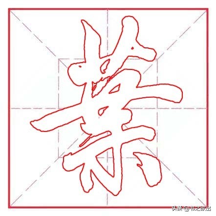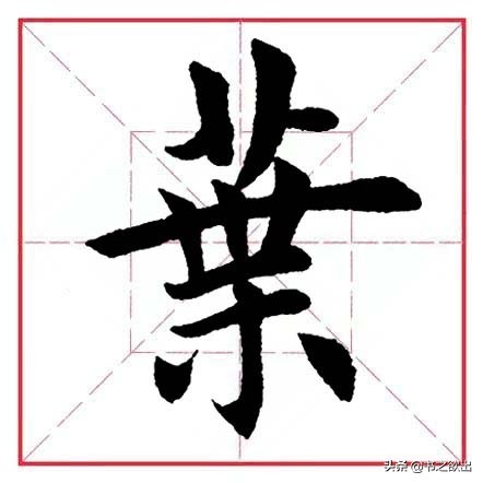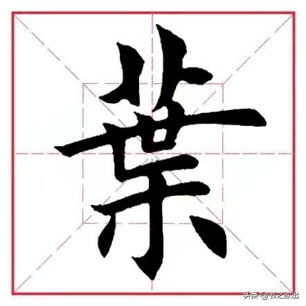 上部“草字头”整体紧凑,不要写散。左竖斜切起笔,向下略轻,勿长,右斜;左横勿重,抗肩,位置稍靠下,收笔藏于竖画;右边小横顺着左横的收笔方向起笔,不要写长,稍下压;右竖起笔稍高,与左竖呈合抱之势,略带撇意。