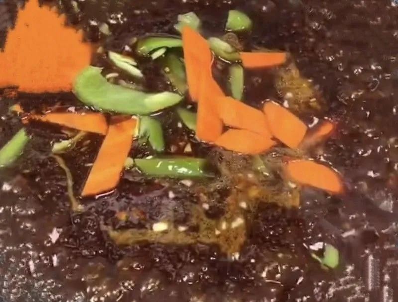先将茄子去皮,切成菱形块状,准备一盆淡盐水,把切好的茄子放入盐水中浸泡15分钟,胡萝卜、青椒切小块备用。