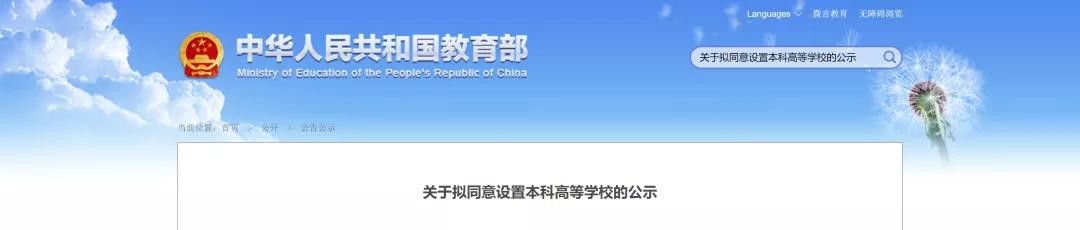 《关于拟同意设置本科高等学校的公示》。