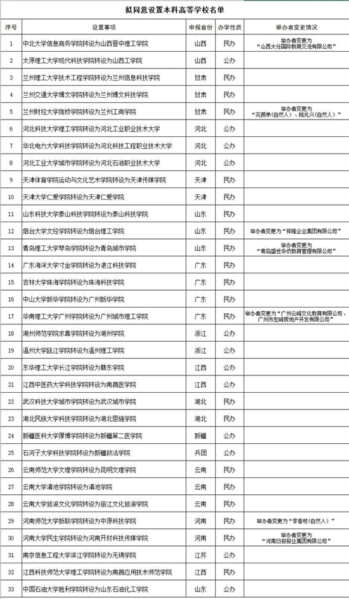 根据《高等教育法》《普通高等学校设置暂行条例》《普通本科学校设置暂行规定》和《关于加快推进独立学院转设工作的实施方案》等法律法规政策规定,经第七届全国高等学校设置评议委员会专家考察和评议,并经党组会审议,拟同意中北大学信息商务学院等33所独立学院转设为独立设置的本科学校,现将学校名单等信息向社会公示。