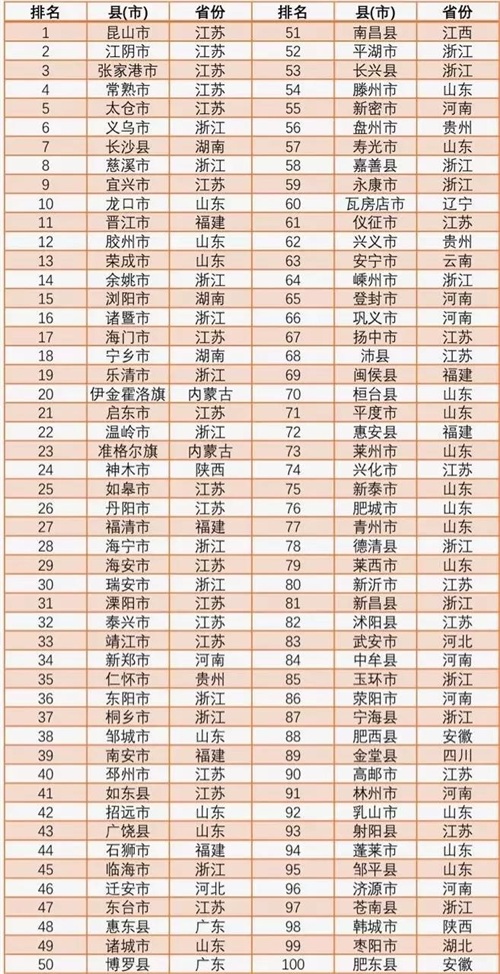 其中,竞争力百强分布在17个省(市),苏浙鲁三省百强数目达65席。江苏占25席,浙江和山东分别占21席和19席。综合经济竞争力十强县(市)分别是:昆山市、江阴市、张家港市、常熟市、太仓市、义乌市、长沙县、慈溪市、宜兴市和龙口市。山西、吉林、黑龙江、广西、重庆、青海、宁夏和新疆都无缘全国综合竞争力百强县(市)。