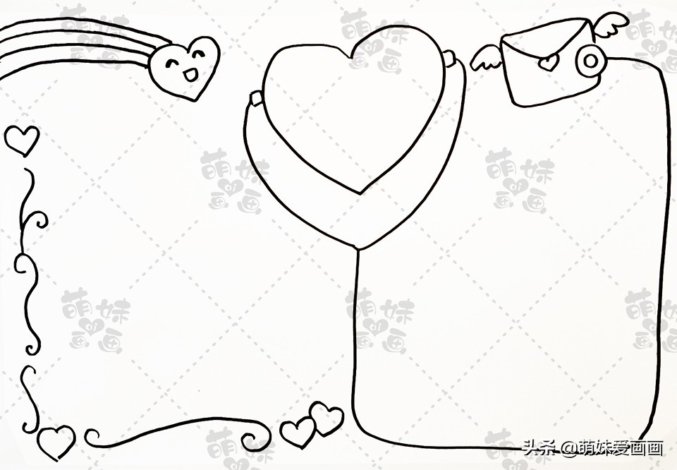 我们用一些简单的曲线来绘制手抄报的边框,用爱心、彩虹、信封等元素来装饰我们的手抄报。