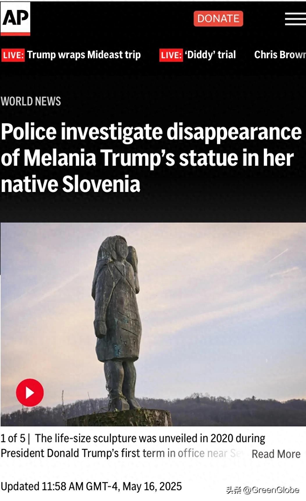 美联社报道,斯洛文尼亚卢布尔雅那(美联社)——斯洛文尼亚警方正在调查美国第一夫人梅拉尼娅·特朗普的青铜雕像的失踪事件,该雕像被锯掉并被从她的家乡偷走。