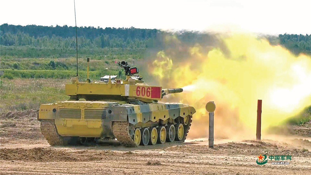 当地时间8月3日,“坦克两项”单车赛中,我军606车组首轮出战,夺得小组第一。图为中国参赛车组火炮射击瞬间。