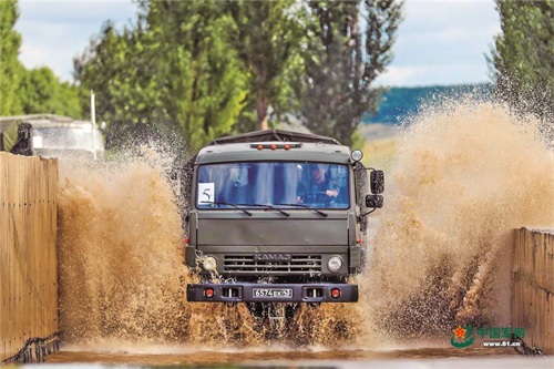 “汽车能手”项目将于8月14日在俄罗斯沃罗涅日州汽车装甲兵训练基地拉开战幕,图为中国参赛队员驾车进行涉水段训练。