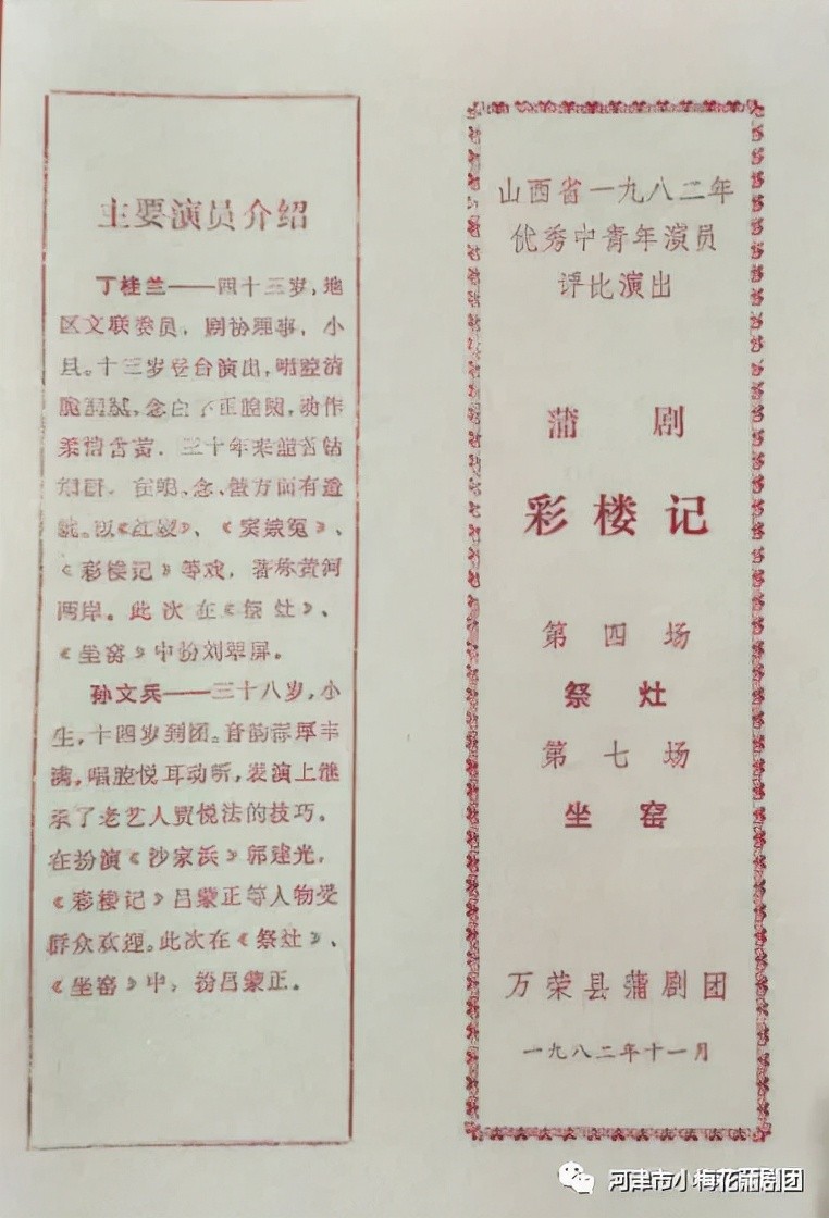 1979年,由丁桂兰、武香香、孙文兵、程永奎、张秀芳主演的《彩楼记》参加运城地区庆祝建国三十周年献礼演出。