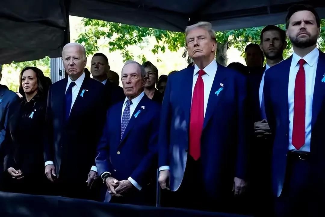 9月11日,拜登(左二)、哈里斯(左一)和特朗普(前排右二)同时出席在纽约世贸中心遗址举行的“9·11”恐怖袭击23周年纪念仪式