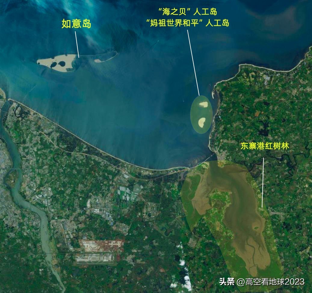 在海南轰轰烈烈的填海运动中,在海南东寨港国家级自然保护区入海口,也有两个三处填海工程,分别为如意岛、“海之贝”、“妈祖世界和平”人工岛,国家叫停之后,如今处于烂尾状态(前面写过关于这些烂尾工程的文章,有兴趣可以去翻看)。