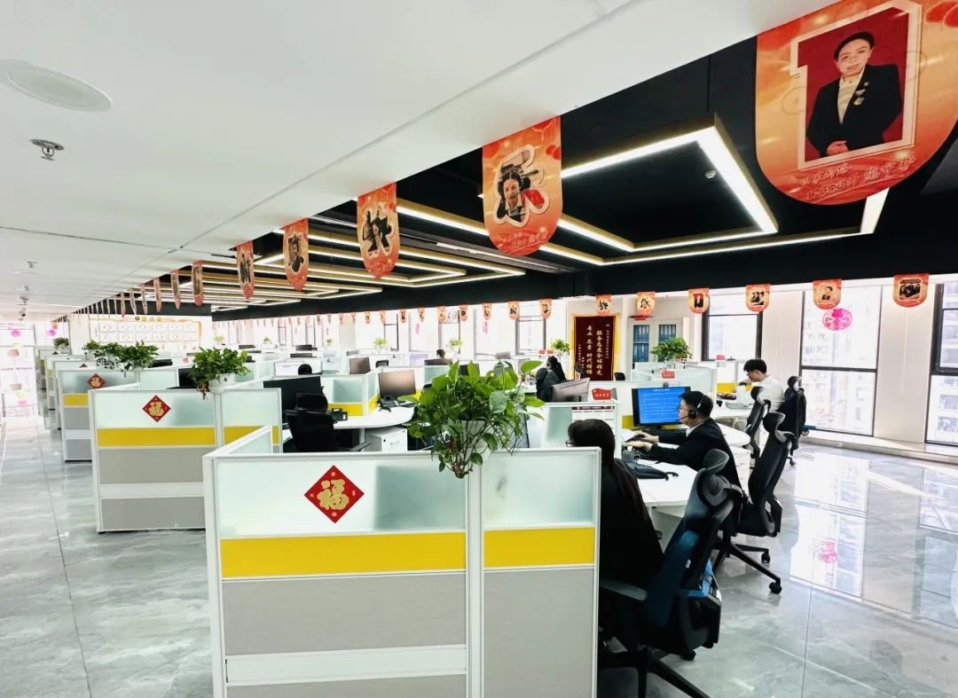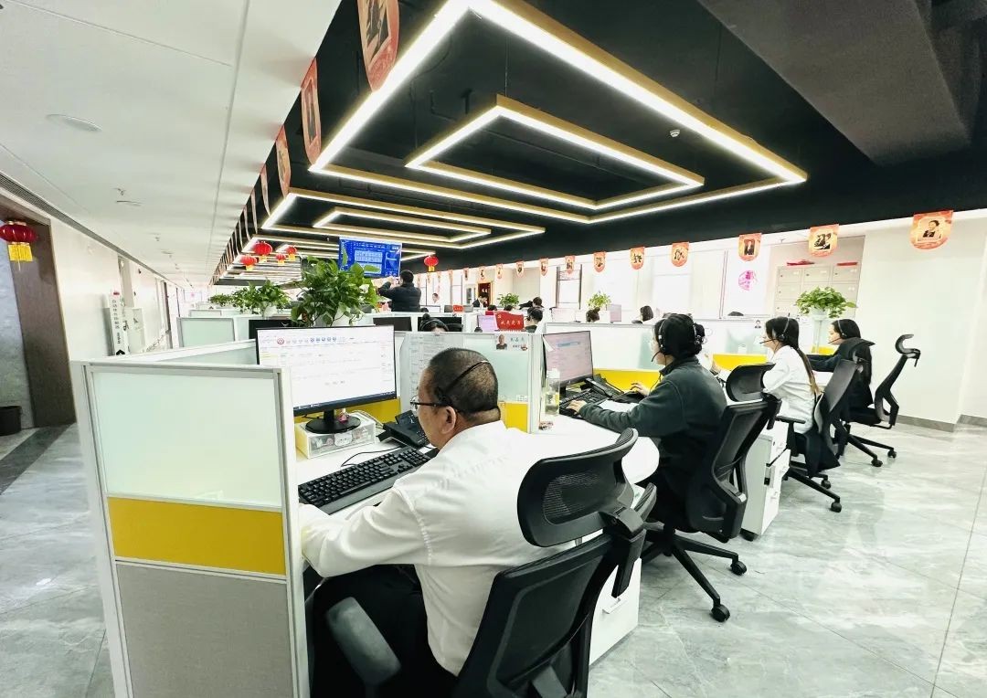 客服中心大厅内挂起火红的灯笼,年味十足。对于他们中的大多数人来说,这个春节又要在工作岗位上度过。