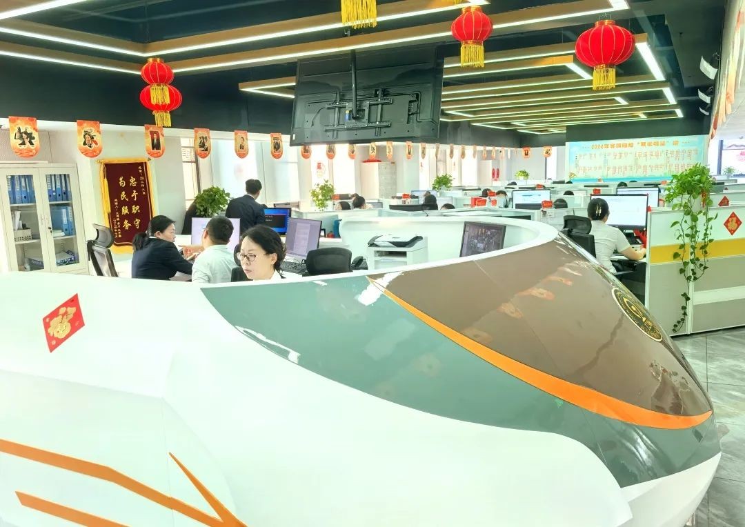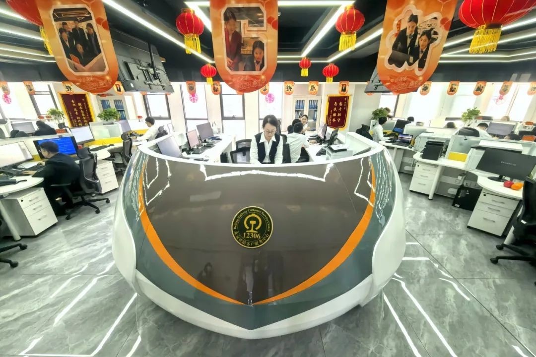 11时,晌午的阳光透过玻璃,将两侧红色窗花的影子映入客服大厅,满满温馨。