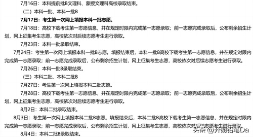 本科二批B:8月3日完成第一志愿的录取,8月4日录取结束。