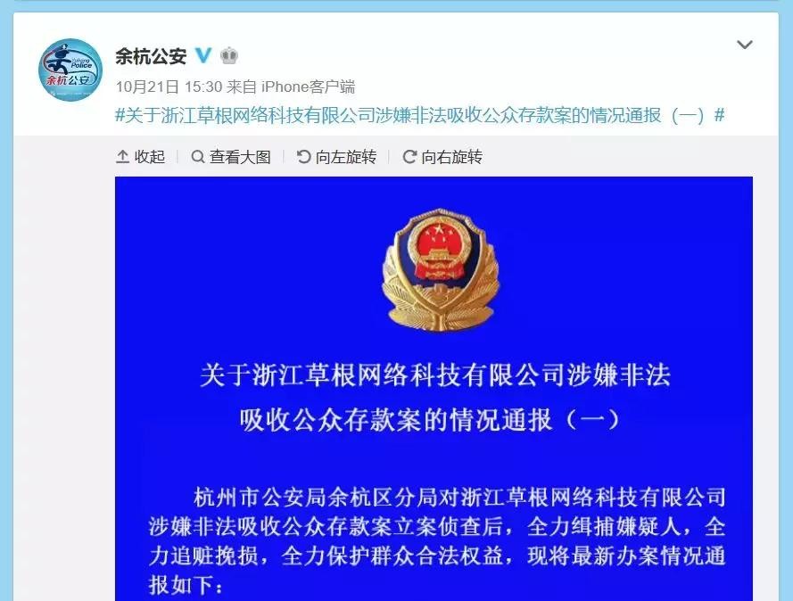 10月21日下午三点多,杭州市公安局余杭区分局在官方微博发布最新案情通报称,已对浙江草根网络科技有限公司(简称“草根投资”)金忠栲等25名涉案嫌疑人采取刑事强制措施。