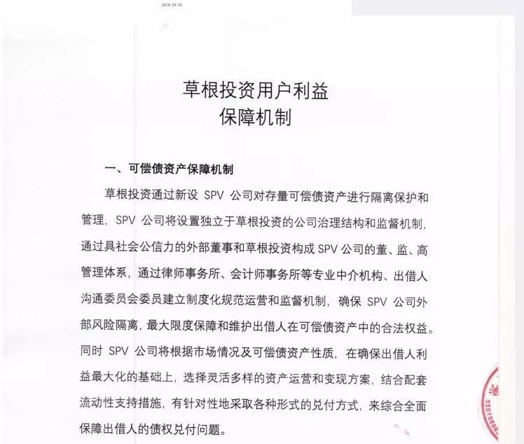 10月18日,草根投资官网发布的《草根投资用户利益保障机制》,提出可偿债资产保障机制、债权资产催收回款保障机制、出借人债权兑付保障机制、增量资产补充担保机制等措施,以保障用户利益,还承诺全额兜底。