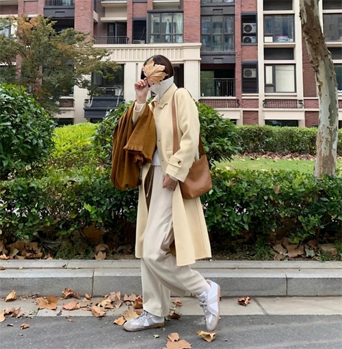 喜爱走韩风的女孩,又怎能缺少一款韩式的大衣呢?颜色很浅的米黄色大衣,这个色系看起来相当温柔,显肤白又有气质。及膝的长度,150小个子也能轻松驾驭,内搭白色毛衣和针织阔腿裤,脚上一双白色运动鞋,很舒适又休闲。出门再围上一条大大的围巾,温暖又随性。