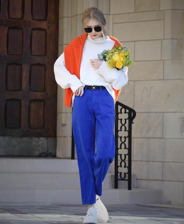 在秋天的时候,天气微凉,白色毛衣可以直接单穿,如果担心单穿显得过于单调与平凡,Lily建议你可以尝试下撞色的穿法。看看这一位街拍,穿着白色高领毛衣,下身选择了一条蓝色牛仔直筒裤,浅色与亮色的碰撞,真的是太时髦吸晴了。肩膀上还利用了一条橘色毛衣作为披肩来装饰,这样不仅起到一定的保暖效果,还丰富了整个造型,显层次又时髦。