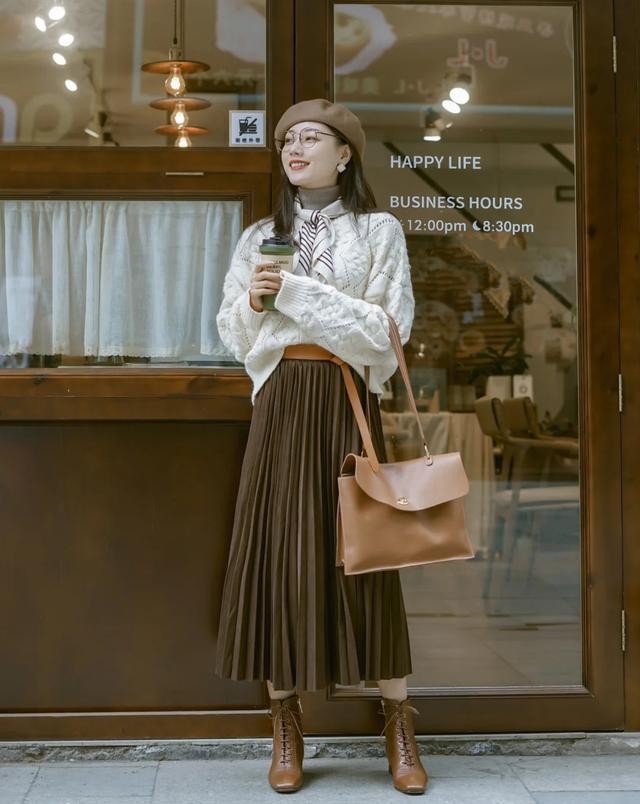 下身搭配了一条深棕色中长百褶半身裙,裙子的面料比较厚实,而且垂感也比较好,最后再加上一双系带短靴,简直是太好穿了,小方头看着就很秀气,还不挑脚型。