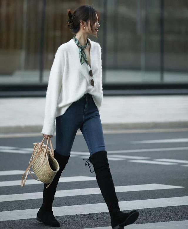 毛衣里面可以配上一件黑色小背心,或者高领打底,下装选择了一条牛仔蓝紧身裤,一双黑色过膝靴,大长腿就这么打造了。