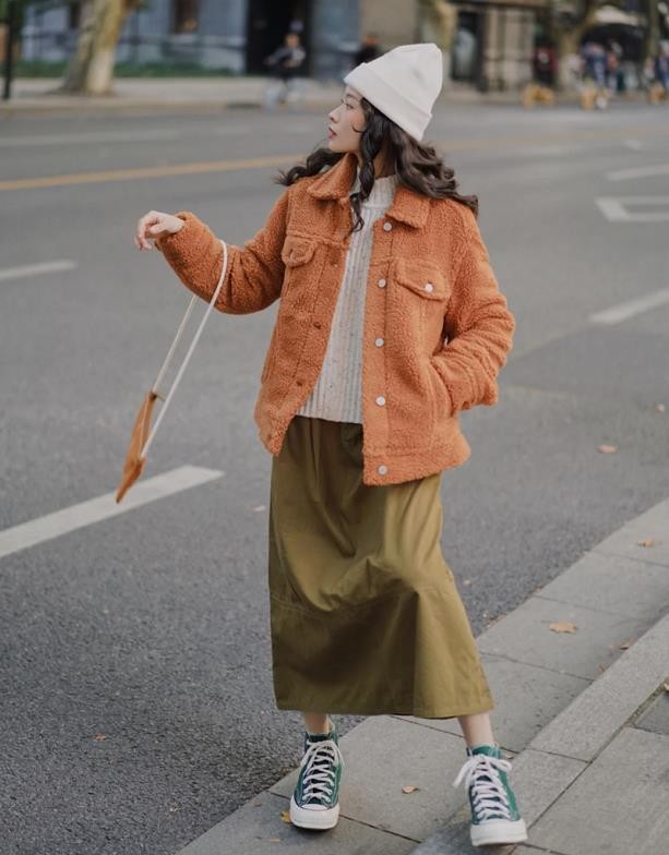 作为与黑色毛衣并齐的白毛衣,百搭是不用多说的,所以,在冬天,也可以选择各种外套来搭,像今年流行的羊羔绒外套,毛茸茸的材质,摸起来不仅舒服还十分保暖。橘棕色的羊羔绒外套,搭配白色毛衣,真的是洋气感满满,最关键的是很吸晴。下身是一条绿色中长半身裙,又暖又可爱,南方的女生,过冬这样穿足矣。