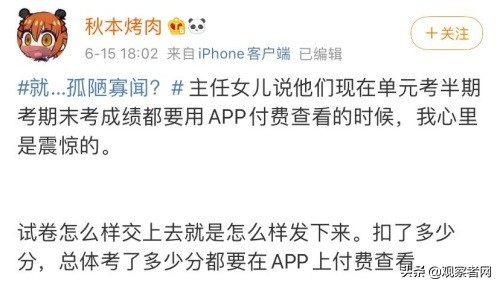 昨天(6月15日),有一位网友在社交网络上吐槽,她主任的女儿现在所有的考试成绩居然要用APP付费查看,试卷上完全没有批改痕迹。