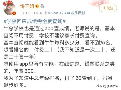 微博大V@饼干姐 在18年时也讨论过此事,她表示自家孩子也是通过APP付费查成绩,查排名一次20元。