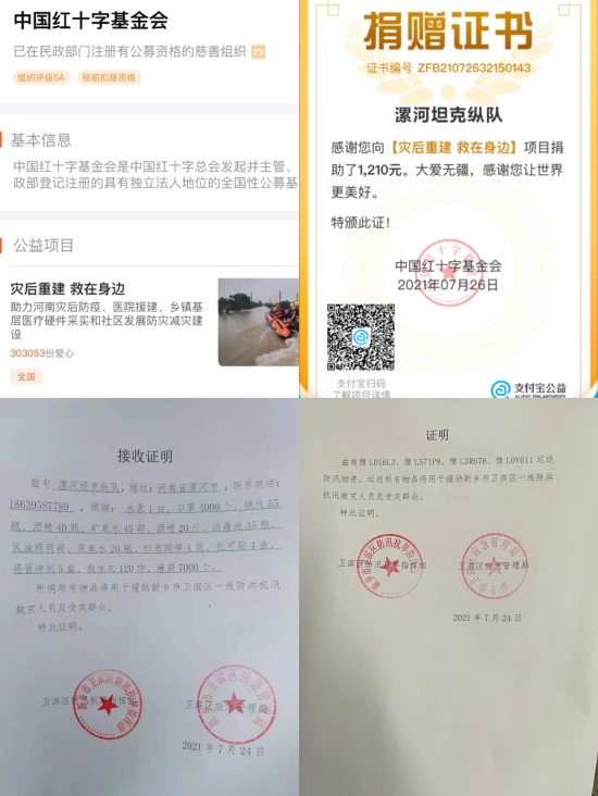 战鼓隆隆激斗志,号角声声催奋进,7月23日,新乡市出现严重内涝,极大的影响着新乡市广大群众的正常生产生活。漯河市坦克纵队袁上琦、罗昭、王庆伟、郭振兴、李意政、温凡 、陈永军在了解到灾情之后连夜集结队伍,筹备救援物资,组织号召社会各界爱心人士捐款捐物,为灾区人民贡献爱心。