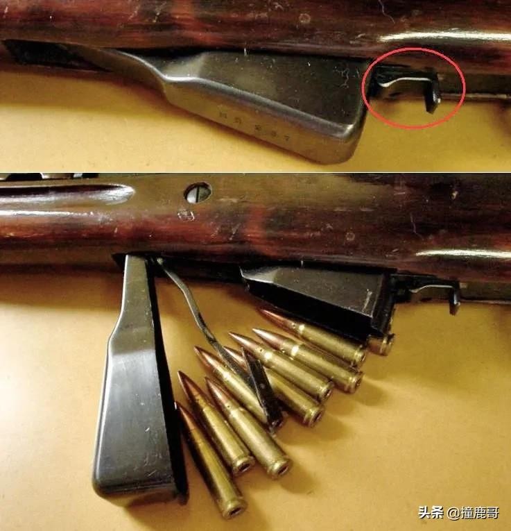 SKS with the magazine closed (top) and open. The magazine release is circled.
