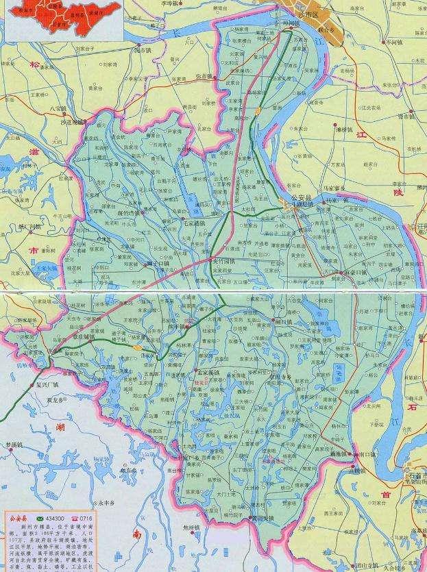 公安县。面积2258平方公里,人口107万,是全国重点粮、棉、油生产基地,闻名全国的鱼米之乡。