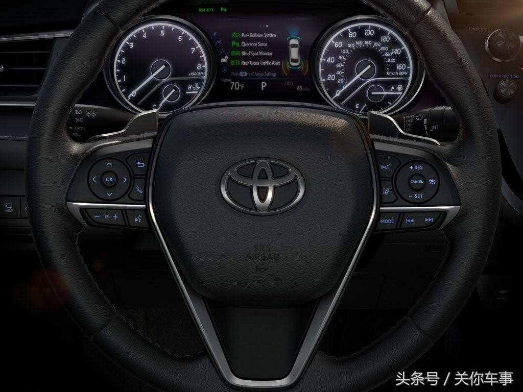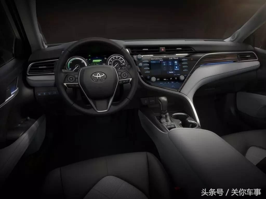 内饰方面,最大的亮点就在中控台了。不规则的四边形切割设计搭配连贯上下的粗条银色装饰带,给人一种不稳定的动感。新一代凯美瑞还搭载了最新的丰田人机智能互联系统,通过10英寸的HUD全彩抬头显示屏、7英寸的液晶数字化仪表盘以及8英寸的中控台显示器传递行车资讯和多媒体信息。前排座椅也经过重新开发与设计,更符合人体工程学,触感也更柔软。