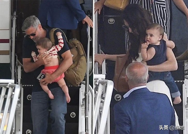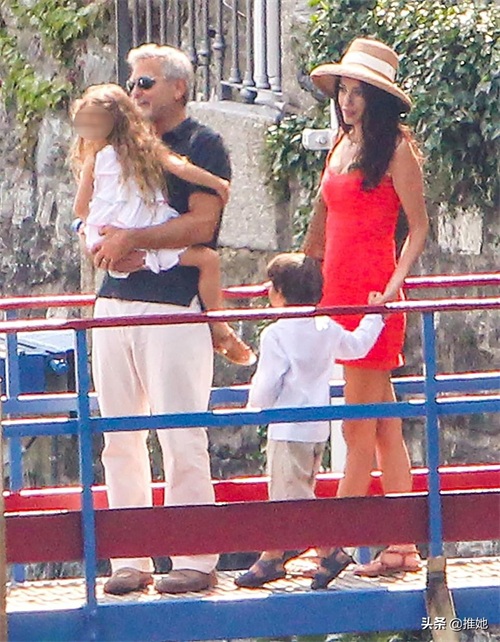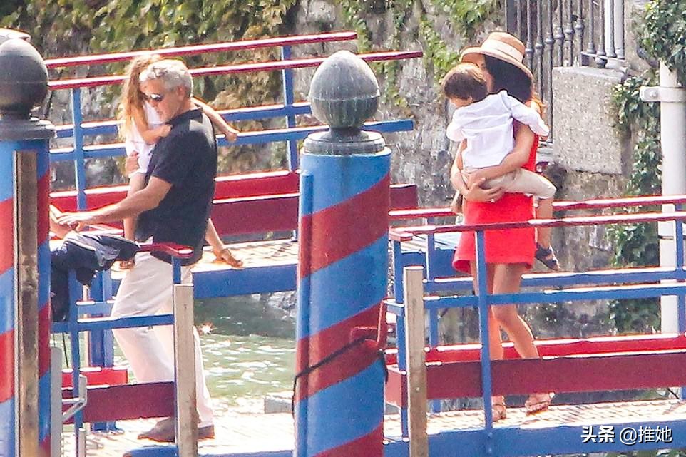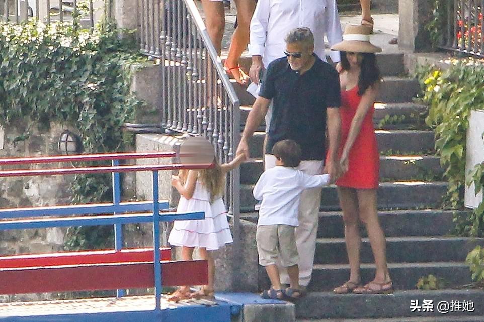 乔治抱着女儿埃拉,把她高高举起来,在意大利的阳光下享受天伦之乐,阿马尔蹲在儿子亚历山大身旁,开心地看着父女俩。