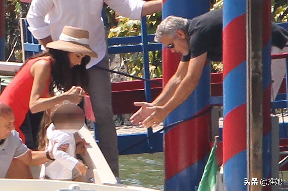 吃过午餐,乔治抱着埃拉,阿马尔抱着亚历山大,准备回到船上。