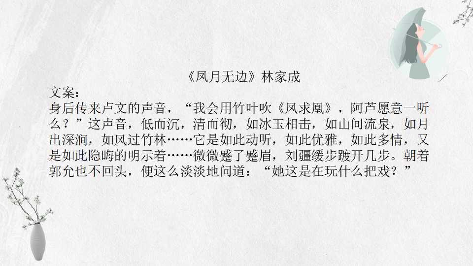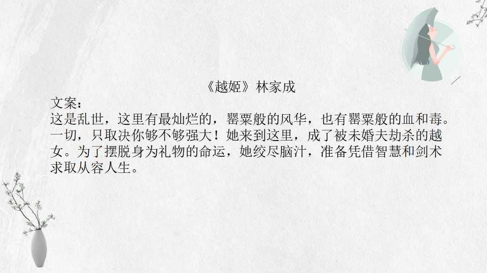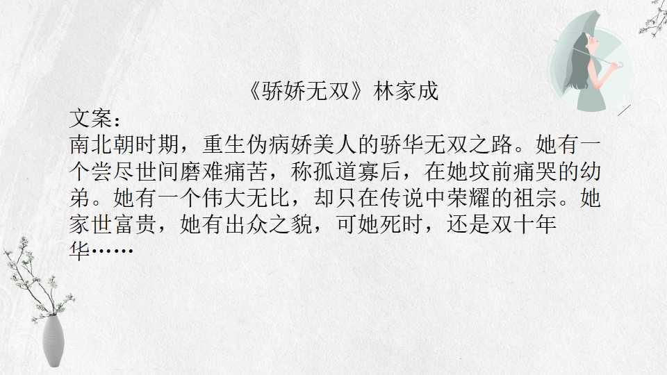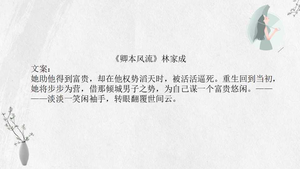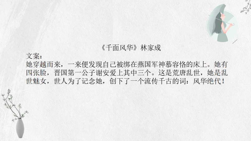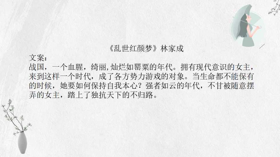林家成的小说多以春秋战国或魏晋时期为背景,讲究魏晋风流。文中女主长相绝美,男主姿态世家风范,小说剧情曲折,百转千回,喜欢古风的小伙伴不要错过。