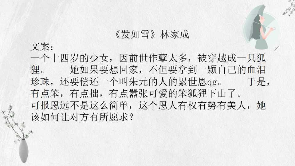 19、 《发如雪》林家成 80万字 BG 完结 男主视角(又名《情狐》)