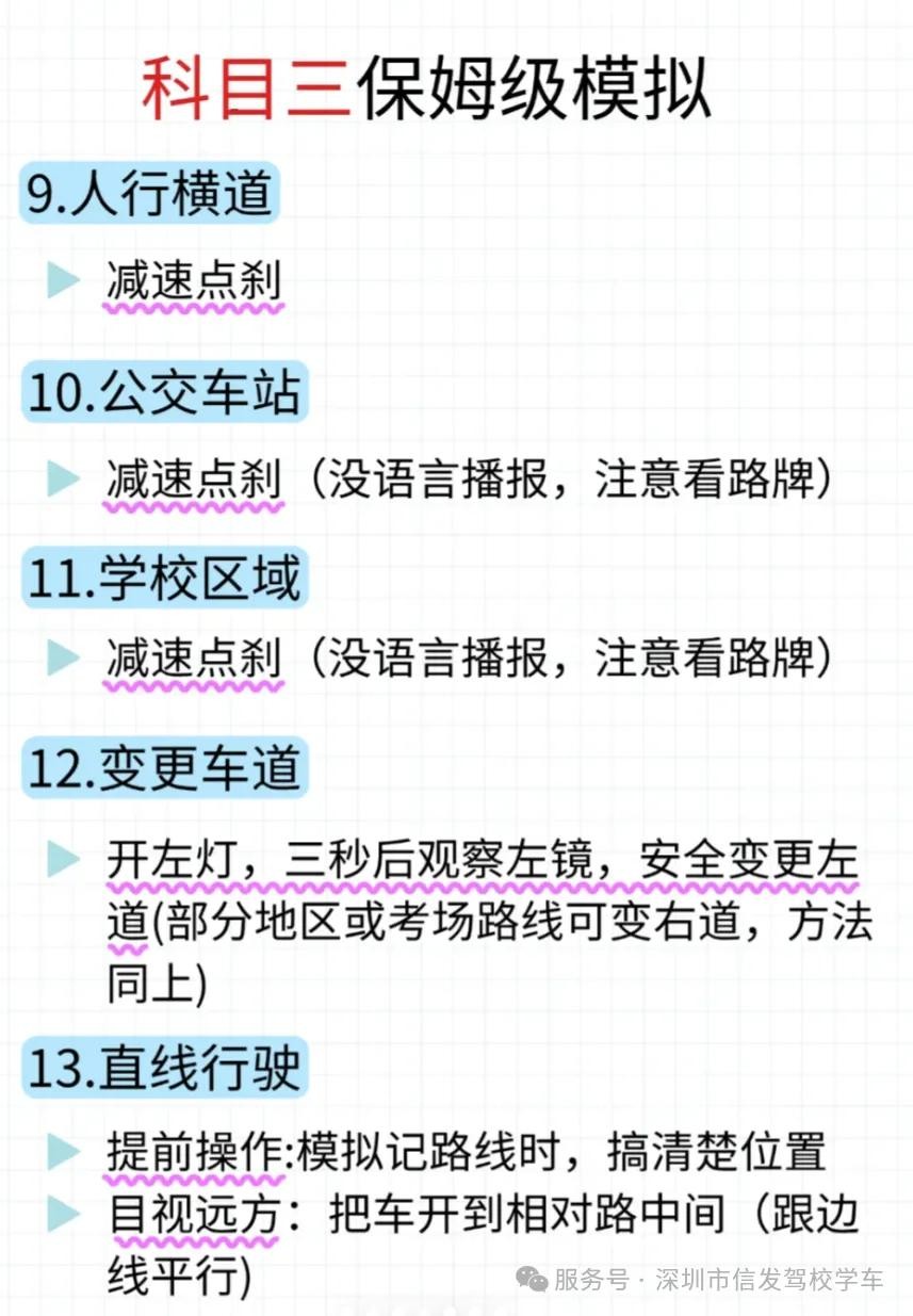 考试之前背好路线,一般教练都会把考场的路线图给你,这些在网上也都可以查得到,以深圳为例,深圳这边科目三的考场有5个,先看你约到哪个考场的考试了,驾校会安排教练针对性的让你去练习,考试的时候一般考场有2-3条线,考试的时候现场随机抽一条线,所以背路线不要只背一条,最好是把几条路线都背熟,哪个线有什么学校,公交车站,人行横道,需要减速慢行的,都要做到心中有数。