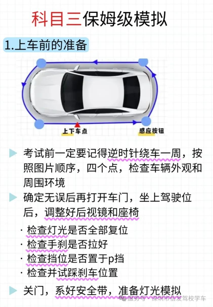考试前一定要记得逆时针绕车一周,按照图片顺序,四个点,检查车辆外观和周围环境。这个就有童鞋因为没做,导致挂科的。