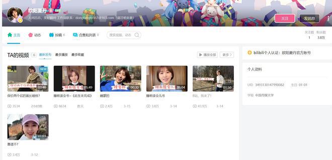 截至 3 月 17 日 18 时,欧阳夏丹 B 站认证账号已相继发布 6 段长度不超过 7 分钟的短视频。其中,她在 3 月 14 日发布的《B 站,我来了!》视频中表示自己要入驻 B 站了,会经常分享有关运动、读书、旅行等内容。