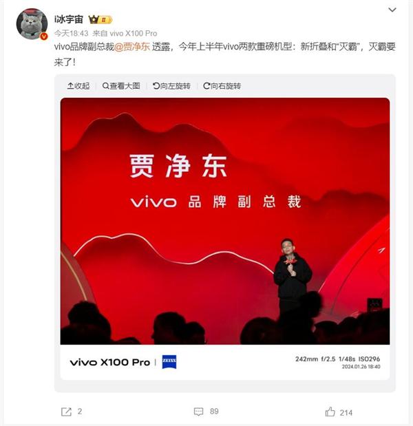快科技 1 月 26 日消息,vivo 贾净东在一场活动中透露,vivo 会在春节后发布一款顶级旗舰以及一款顶级折叠屏。