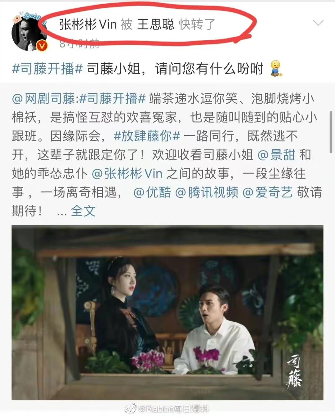 值得一提的是,在景甜出演《司藤》这部剧的时候,王思聪还转发了张彬彬的文案帮景甜宣传新作品,实属罕见。