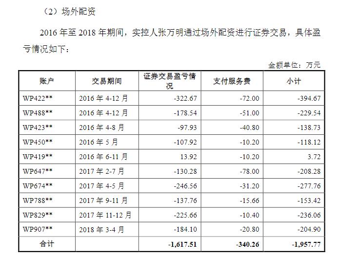 2016 年至 2025 年期间,实控人张万明通过场外配资证券交易形成的亏损共计 1,957.77 万元,由证券交易亏损 1,617.51 万元和支付服务费用 340.26 万元构成。