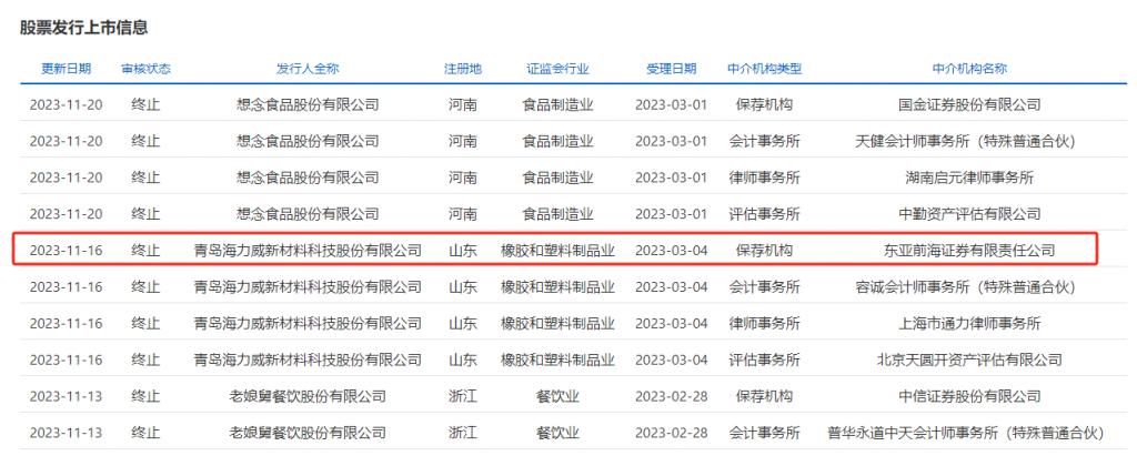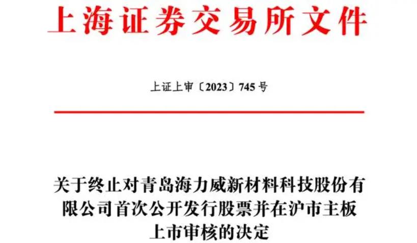 财联社 11 月 21 日讯(蓝鲸 沈超)日前,上交所发布公告表示,终止对青岛海力威新材料科技股份有限公司(以下简称 " 海力威 ")首次公开发行股票并在沪市主板上市的审核。据悉,此次终止上市实为海力威及其保荐机构前海证券主动撤回了上市申请。