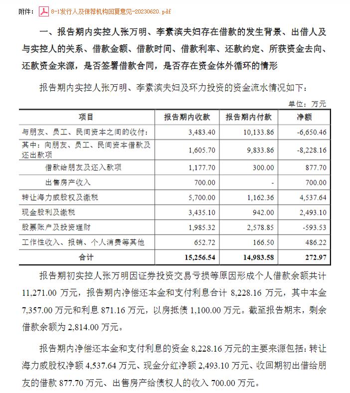 6 月 20 日,海力威上交所询问进行了回复,回复意见表示,报告期内,实际控制人银行账户大额资金往来主要由实际控制人向其朋友、发行人员工及民间借贷机构的借款和还款产生,合计收款 15,257 万元,付款 14,984 万元。报告期初实际控制人存在较大的对外借款余额,主要系实际控制人借款进行证券交易产生较大金额的亏损,为偿还借款本息,实际控制人不断通过向其朋友、民间借贷机构及部分发行人员工借款。