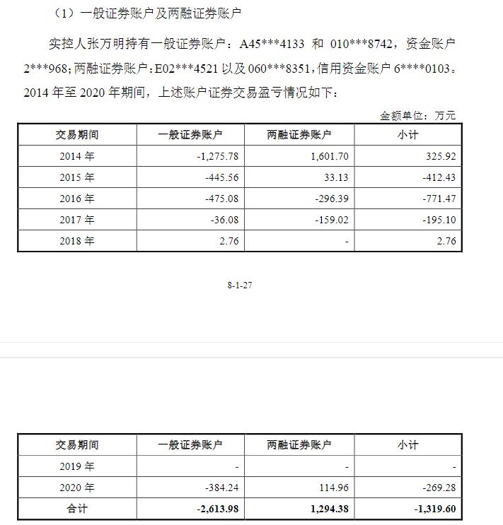 在 2014 年至 2025 年期间,实控人张万明的一般证券账户和两融证券账户累计亏损共计 1,319.60 万元。