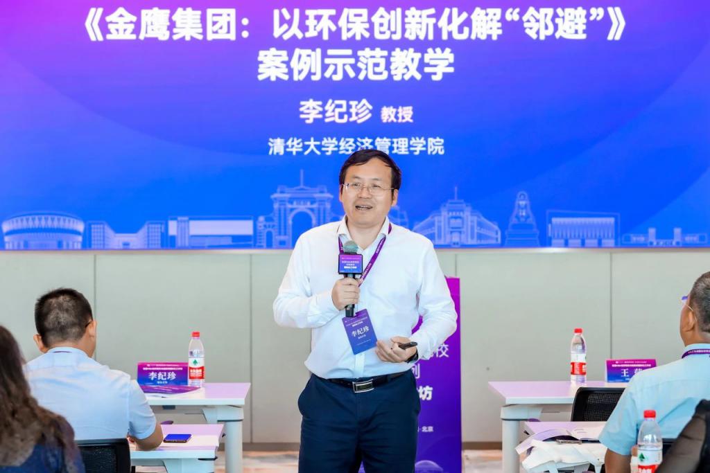 随后,李纪珍教授就 " 金鹰集团:以环保创新化解‘邻避’ " 进行案例示范教学,并围绕案例开发与教学心得进行分享。金鹰旗下的亚太森博和赛得利分别经历了各自 " 决定企业生死存亡 " 的环保事件。搬迁还是留下,留下又如何与所在的城市共生共荣,是摆在金鹰集团两家企业领导面前的共同议题。基于此案例,李纪珍教授抛出问题 " 企业最重要的使命是什么?" 并与参会老师展开交流。在案例开发与教学心得分享中,李纪珍教授以清华经管学院中国工商管理案例中心的案例开发为例,围绕案例开发步骤、过程、注意事项等展开讲解,并强调案例要融通实践经验与理论创新,以推动学术发展。