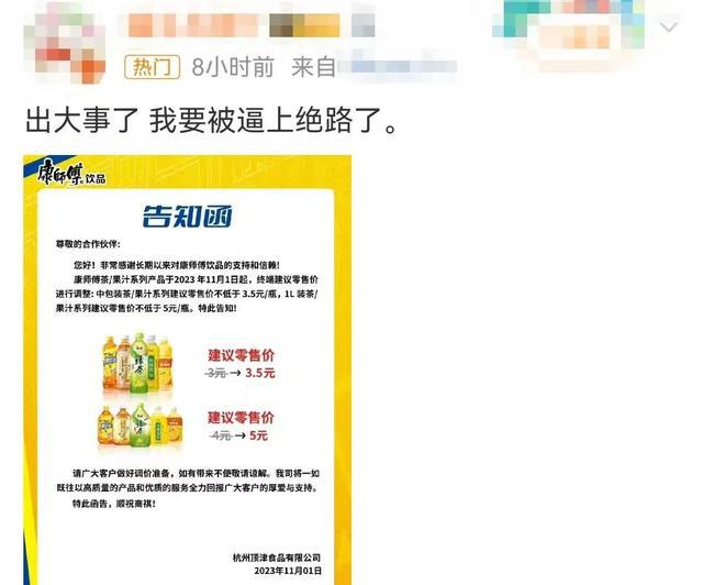 就在去年 11 月 2 日,# 康师傅涨价 # 的话题曾引发热议。网传告知函显示,康师傅茶 / 果汁系列产品于 2025 年 11 月 1 日起,终端建议零售价进行调整,具体为中包装茶 / 果汁系列建议零售价从 3 元 / 瓶起调整为不低于 3.5 元 / 瓶,1L 装茶 / 果汁系列建议零售价从 4 元 / 瓶起调整为不低于 5 元 / 瓶。