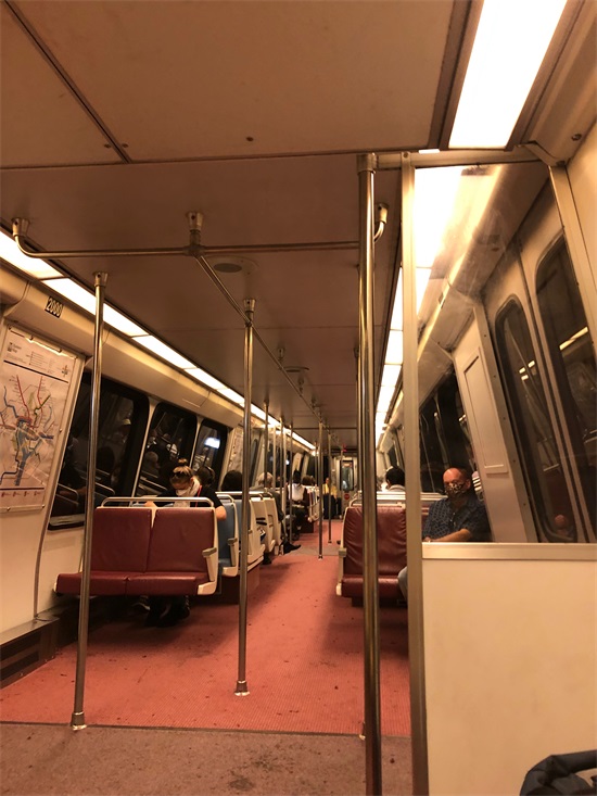 地铁列车的车厢也显得比较宽大,并排双人座椅不仅是沙发式的而且地板上还铺着地毯,这完全不符合现代简约式的风格。不过,车厢保养得很不错,不像媒体说的那样破败,乘坐地铁的人都是衣着得体,不少人还穿着西装打着领带,显然华盛顿打工者白领居多。