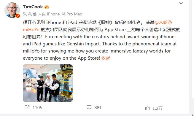 3 月 30 日,苹果 CEO 库克现身米哈游总部,并晒出和《原神》创作者合影。