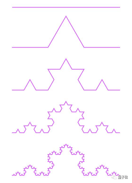 比如科赫曲线(下图为它的 4 次迭代过程),每一部分都由 4 个跟它自身比例为 1:3 的形状相同的线组成,它的豪斯多夫维数就约等于 1.26。