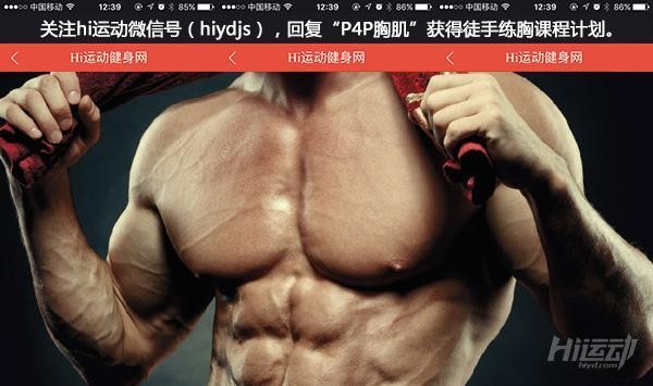如下图中所示,推荐大家关注我们hi运动健身微信号(hiydjs),回复“P4P胸肌”就可以获得全套俯卧撑胸肌训练计划。
